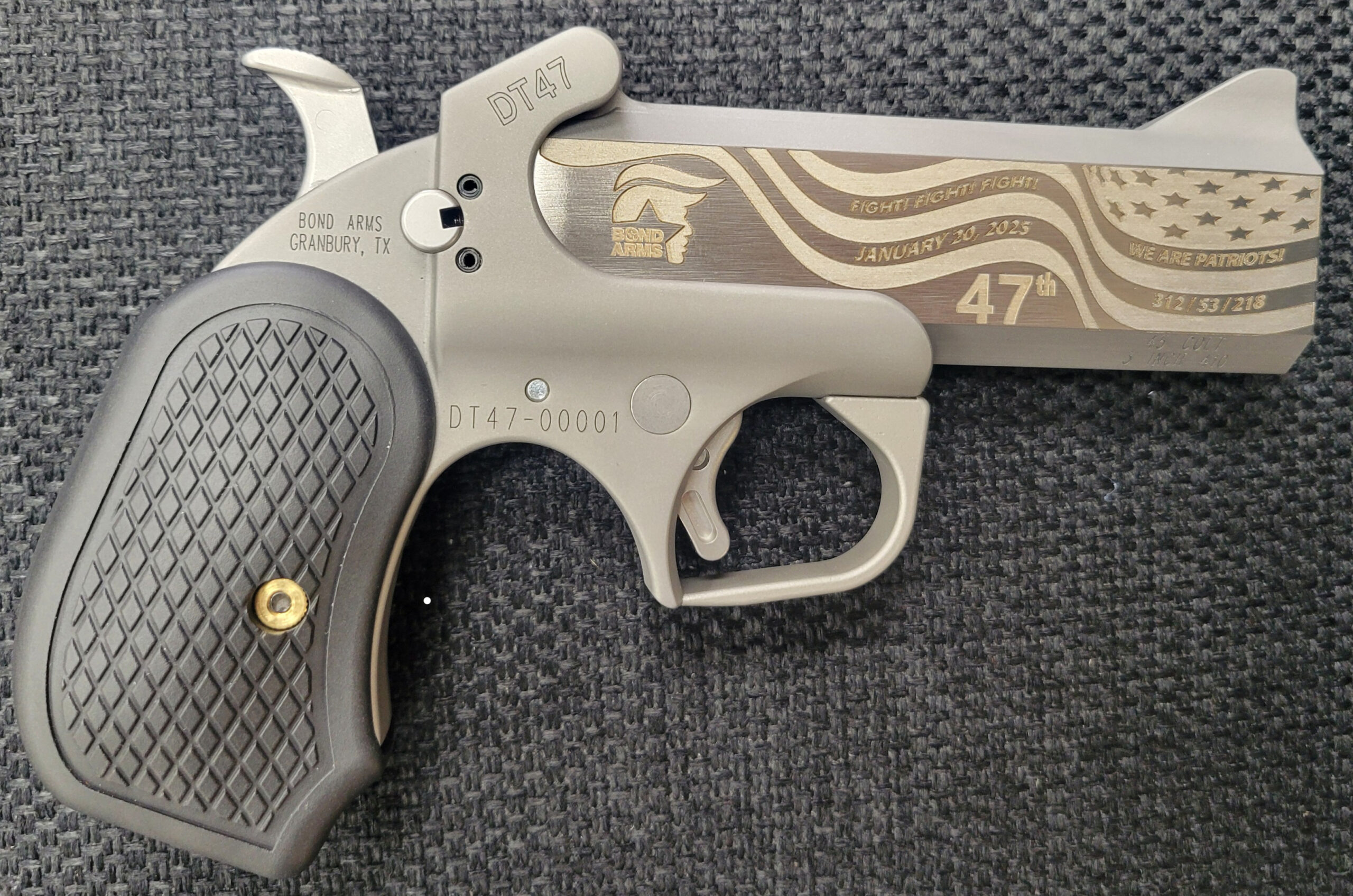 DT47 – 47TH President Limited Edition has a Stainless Steel frame and 45/410 4.25 custom engraved barrel with Rough Series Finish* Trigger Guard and B6 extended grips